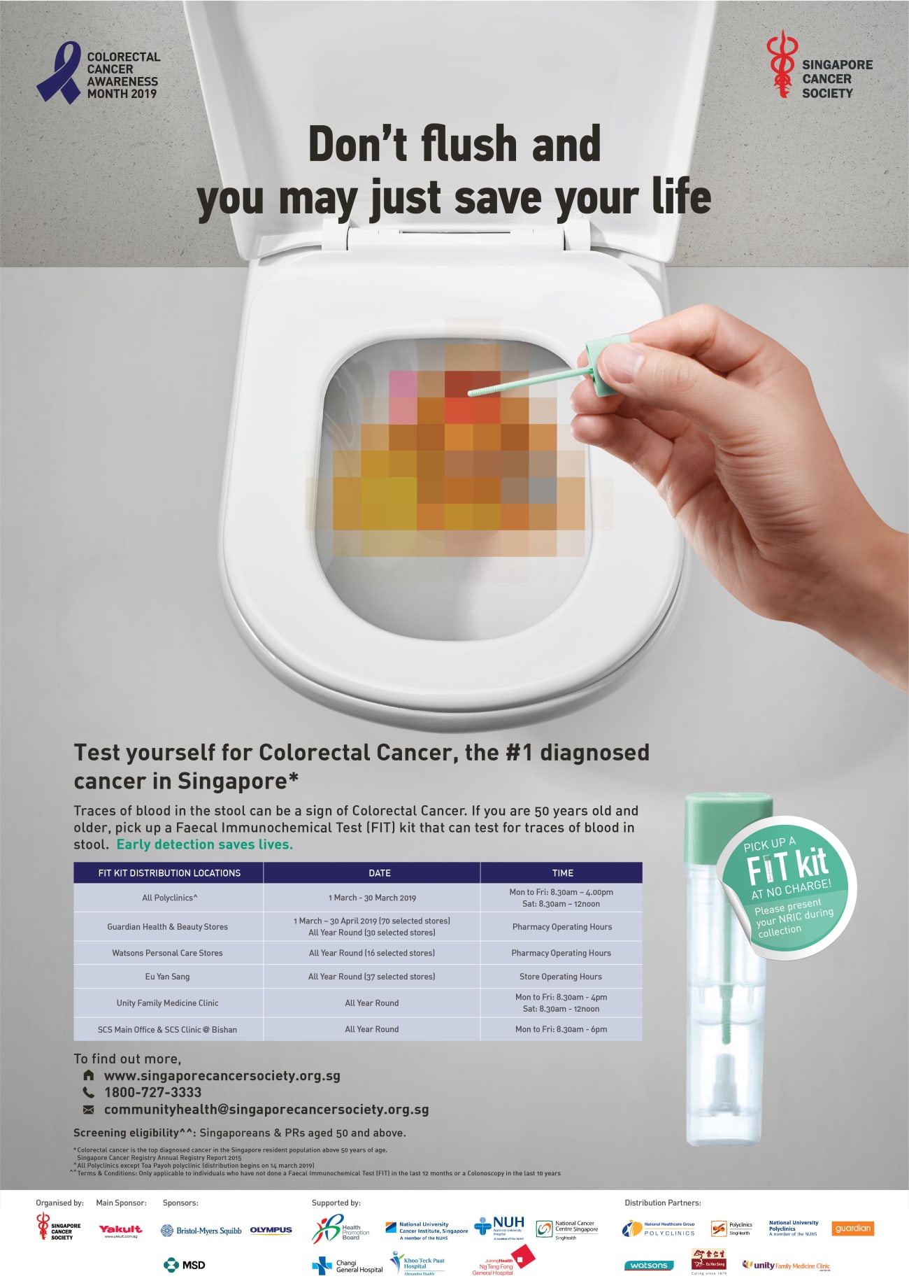 Raffles hospital will be offering free fobt faecal occult blood test screenings from feb 18 to april 30 to people aged 50 and above to help in the testing of colorectal cancer.